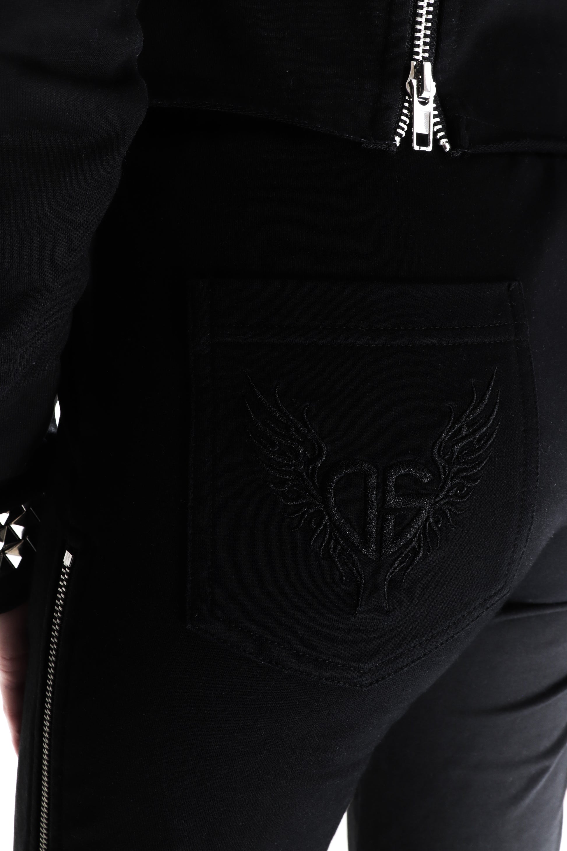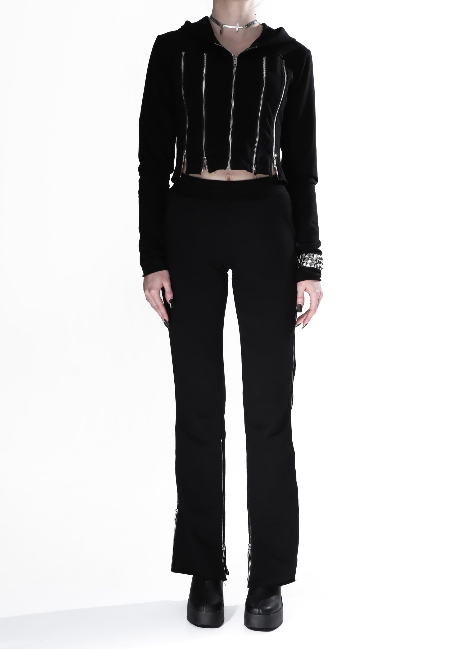 Prosty, lekko rozszerzany krój ze średnim stanem, który optycznie wydłuża nogi. Metalowe, funkcjonalne zamki na nogawkach pozwalają regulować fason i nadają industrialny charakter.